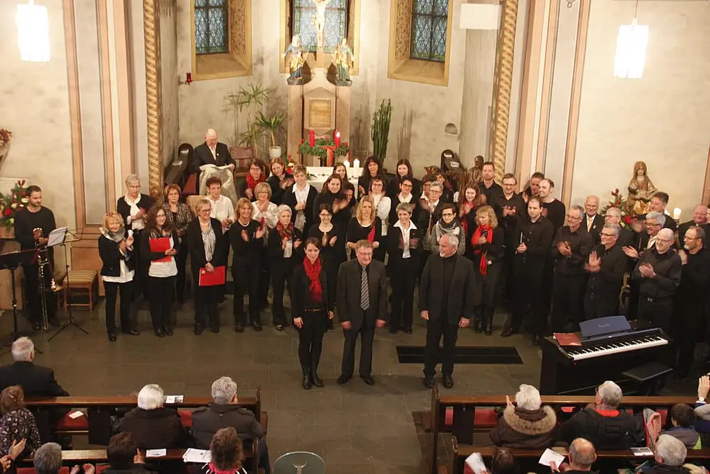 Die Dirigenten Maria Wallussi, Musikdirektor Helmut Velten und Walter Frink (von links) mit den Sängerinnen und Sängern beim Adventskonzert in Oberelbert.