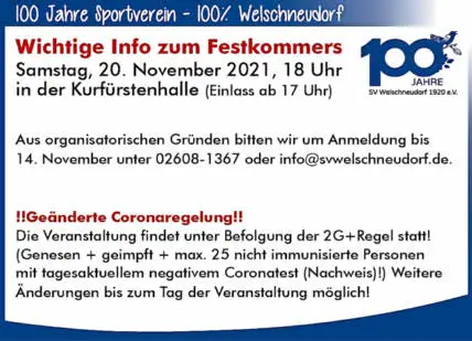 Der SV Welschneudorf feiert sein 100-jähriges Bestehen (inzwischen schon 101-jähriges) mit 2G+-Regel. (Grafik: SVW/Krakl)