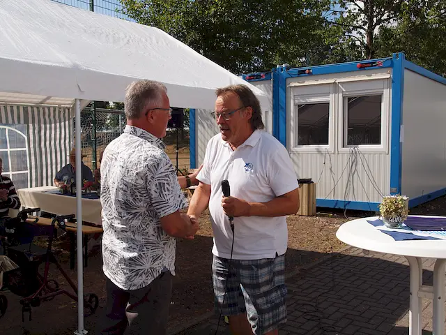 Siegfried Schmidt (links), Inhaber der Schreinerei Schmidt, gratulierte ebenfalls nachträglich zum Jubiläum und würdigte die Rolle des SV Welschneudorf für die Welschneudorfer Gemeinschaft.