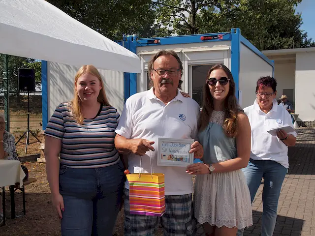 SV-Vorsitzender Berty Simon freute sich auch sehr über die Gratulation durch die Damen des Tanzsportvereins Welschneudorf.