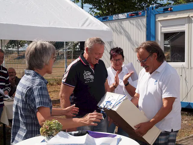 Melanie Höber und Hans-Willi Klein (von links) vom Welschneudorfer Tennisclub überreichten zum Jubiläum nachträglich ein ganz besonderes Erinnerungsstück: „Ottos Medizinschrank“.